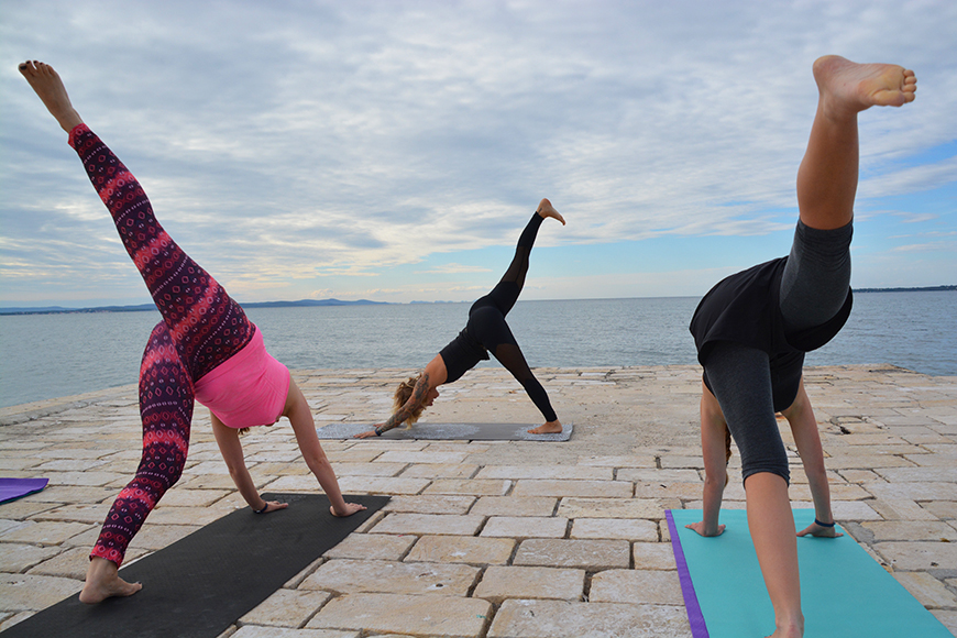 Seit dem beschriebenen Tag ist gut ein Monat vergangen – und wir befinden uns im kroatischen Zadar. Richtig, meine Neugier und Reiselust war letztendlich größer als mein innerer Widerstand. Nun sind wir gemeinsam mit der lebensfrohen Henni vom Veranstalter Yoga Travel & Friends und Jelena, unserer ziemlich lässigen Yoga-Crossfit-Trainerin, auf dem Weg vom Flughafen zu unserem Hotel mit dem wohlklingenden Namen „Funimation Club Borik“. Trotz des Schlafmangels bin ich guter Dinge, denn wie ich grade erfahren habe, bin ich zumindest nicht der einzige männliche Teilnehmer in unserer kleinen Gruppe. Zu siebt werden wir die kommenden Tage Geist und Körper stählen – oder vielleicht auch einfach entspannt am Meer abhängen. Yeah, das Hotel liegt direkt am Strand. Zudem gibt es eine fette Rutsche und einen riesigen Pool. Außerdem steht eine entspannte Massage im luxuriösen Spa auf unserem Wochenplan. Nicht zuletzt hat Zadar eine richtig hübsche Altstadt… Ausreichend Alternativen, falls Yoga doch nichts für mich sein sollte. Alles wird gut. Hoffentlich.